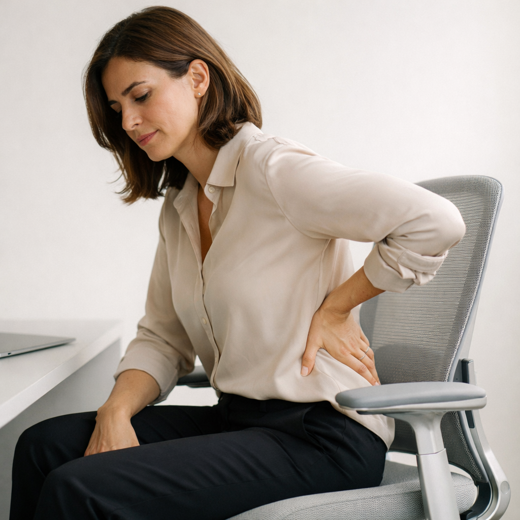 Sensação de peso e queimação na região lombar após horas sentado.