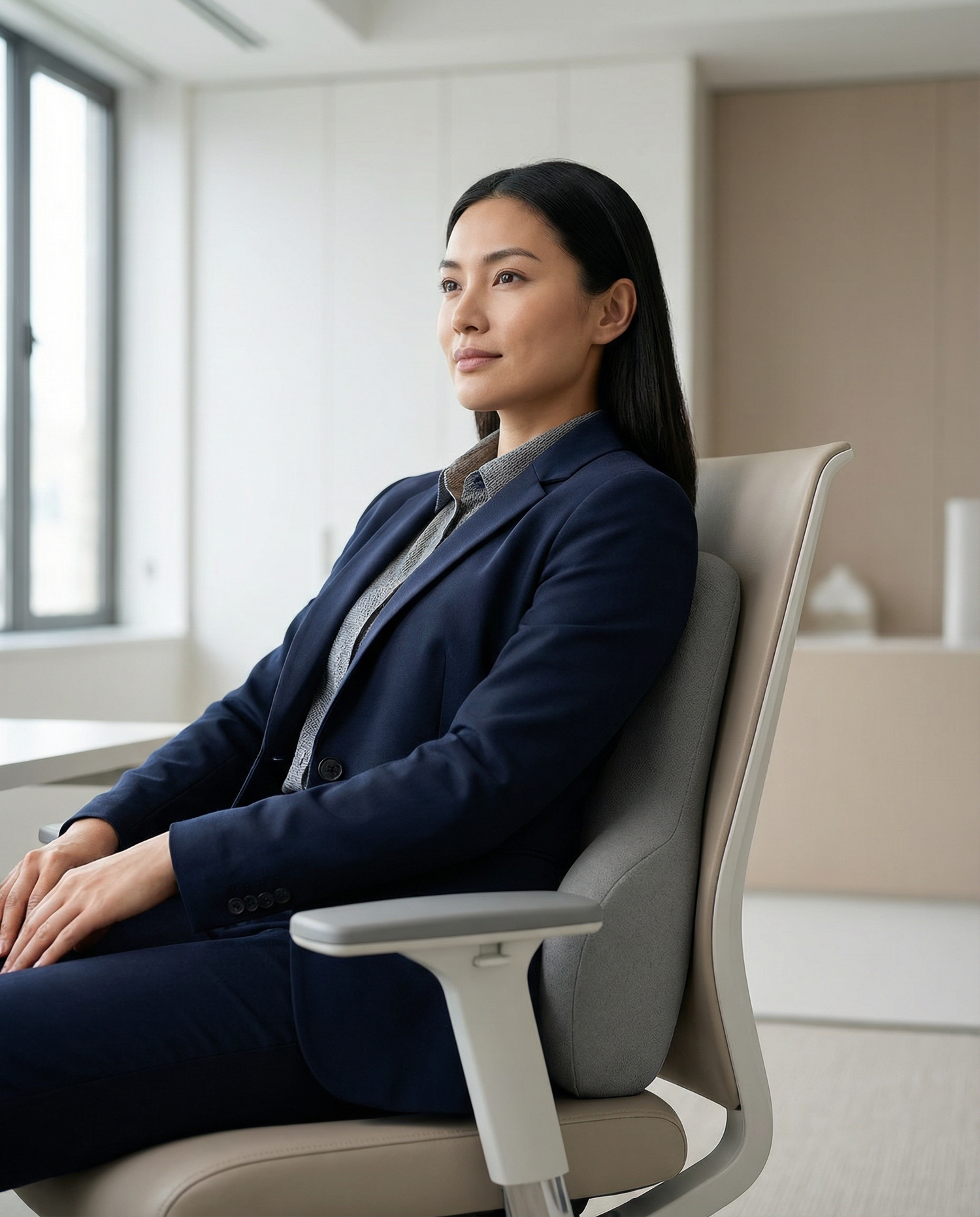 O design ergonômico auxilia na sustentação da curvatura natural da lombar, ajudando a reduzir a pressão na região e favorecendo uma postura mais alinhada.